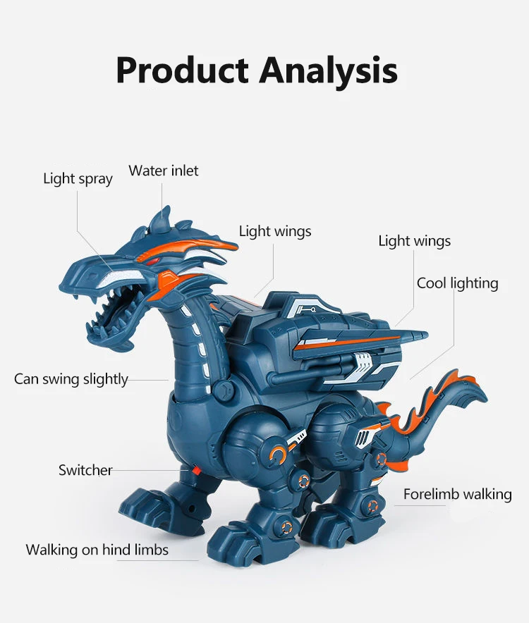 Atomized fire-breathing: The dinosaur has a built-in atomizer, you only need to inject water into it, mix the light with the water mist, and turn into a fire dragon spraying flames from the mouth!