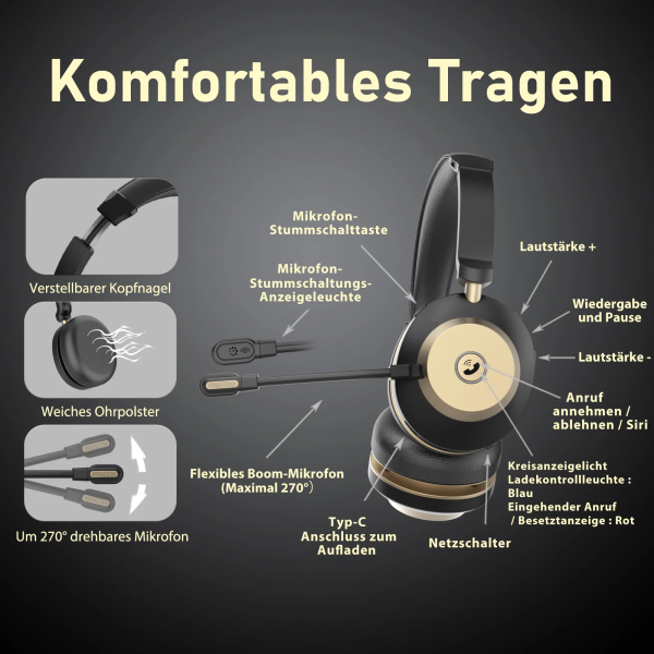 Adjustable headphone band, adaptable/breathable earmuff, Flexible Boom Mic. 270°rotatable